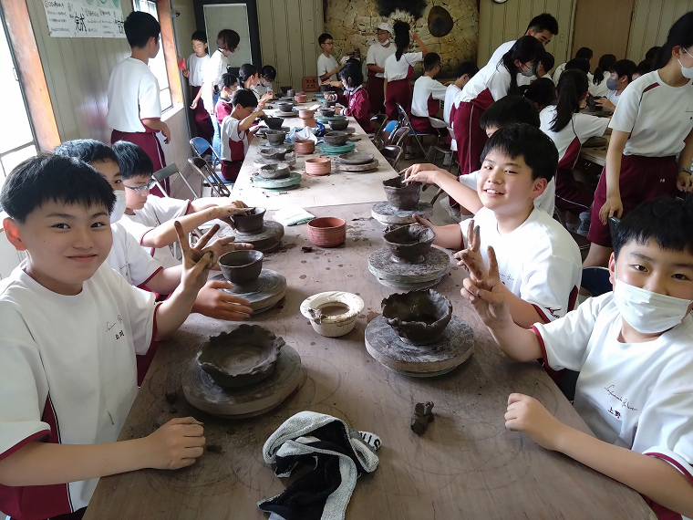 中学1年生での信楽陶芸体験。思い思いに作り上げた陶器は文化・芸術の日に展示され、その後は各家庭に持ち帰ります。
